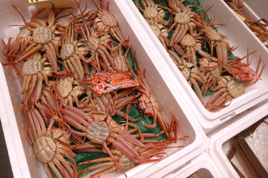 【ズワイガニ】11/6に富山県以西で解禁となり、冬の味覚が豊洲市場へ初入荷。オスは「松葉がに」、「越前がに」、「加能がに」、メスは「せいこがに」、「せこがに」、「香箱がに」など地域ごとに呼び名が異なります。写真はオス、メスともに兵庫県香住産。甲羅に付いている黒い粒は、カニビルの卵嚢。
