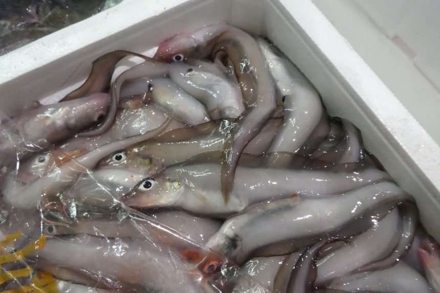 【ノロゲンゲ】細長い体はゼラチン質でプヨプヨとやわらかい。背びれ、尻びれ、尾びれはつながっていて、腹びれはない。ゲンゲの仲間ではタナカゲンゲとともに食べられています。ぬめりごと調理して、味噌汁や吸い物で味わうほか、塩焼きや煮つけなどにも。干物にも加工。山形県産で、箱には「幻魚」。