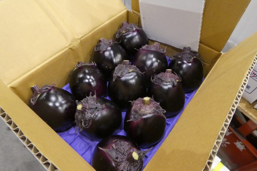 【ナス】この時期、さまざまなナスが入荷しますが、写真は静岡市産の「折戸なす」。徳川家康に献上していたと記録が残り、「一富士二鷹三なすび」のなすびは、このナスだと言われています。明治以降栽培が途絶えましたが、2005年に復活。形は丸く、果肉は緻密で濃厚な味わいが特徴。ヘタのトゲは鋭い。