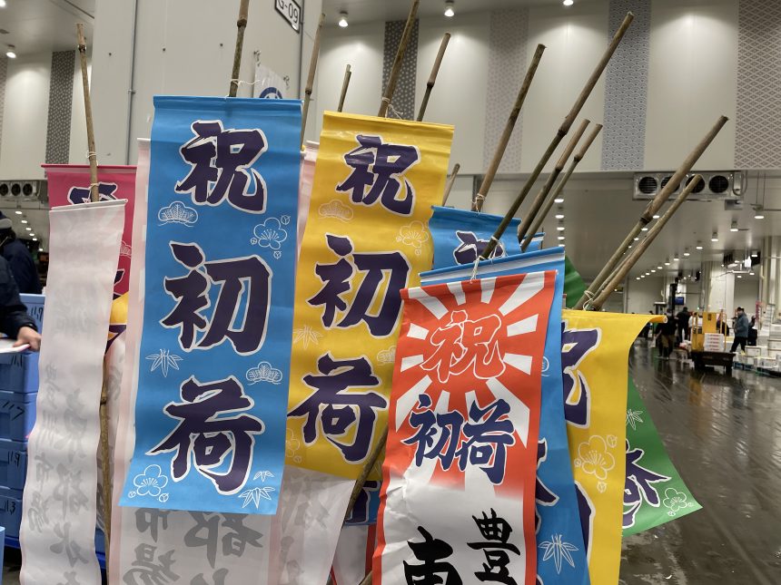 豊洲市場では1月5日早朝、水産物部と青果部ともに初市が行われ、多くの関係者が来場しました。水産物部の大物売場には約30社のメディアが来場。例年話題となる生鮮マグロの初セリでは、大間産クロマグロがキロ8万円(1本1688万円)の最高値で競り落とされました。各セリ場で行われた卸・仲卸の代表者による挨拶では、オミクロン株への警戒と市場機能の維持に触れたほか、卸と仲卸が手を取り合った形での集荷・販売、新しい時代に向けた取り組みなどが呼び掛けられました。