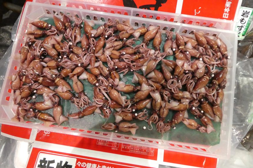 【ホタルイカ】3月から入荷する富山県より早く市場へやってくるのが、兵庫県をはじめとする山陰沖で漁獲されたホタルイカ。富山湾では定置網での漁獲ですが、山陰沖では底引き網での漁獲。山陰沖はやや小粒ですが、ひと足早い春の味覚をどうぞ。写真は香住産のボイルホタルイカ(さくら煮)です。