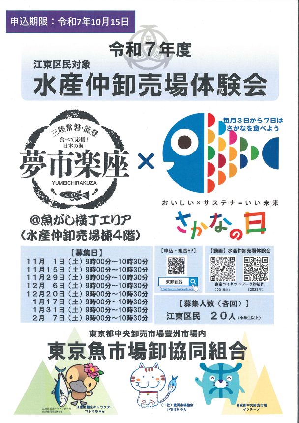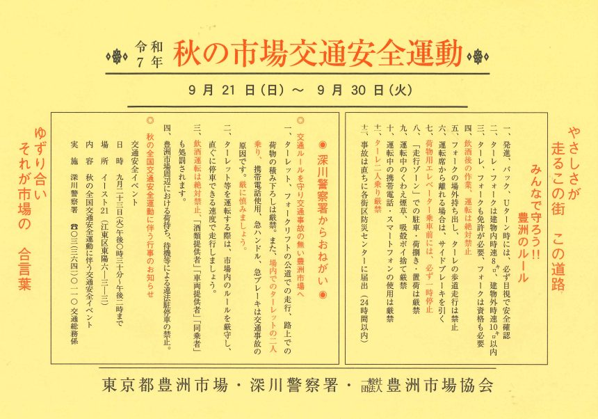 警備・交通 2025.9.19 【交通】秋の交通安全運動実施(9/21-9/30) 豊洲市場協会は9月21日(日)~9月30日(火)、東京都豊洲市場、深川警察署の協力のもと、「秋の市場交通安全運動」を実施します。秋の全国交通安全運動に合わせて行うもので、特別交通指導などを通じ、市場関係者の交通安全徹底 […]