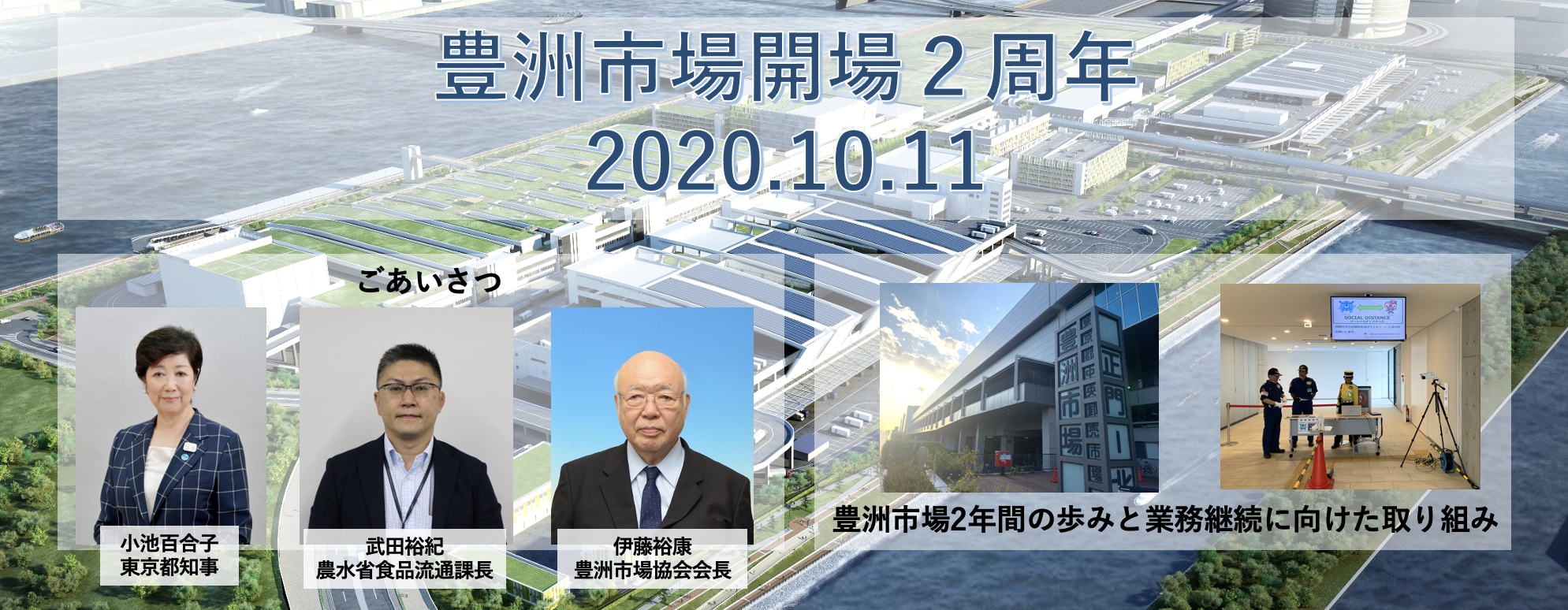 このような状況の中、開場2周年にあたり、記念式典やイベントが開催できませんが、関係者の皆様に向け、オール豊洲市場の団体である豊洲市場協会の伊藤裕康会長よりご挨拶をさせていただくとともに、小池百合子東京都知事武田裕紀農林水産省食料産業局食品流通課長よりメッセージを頂戴しておりますので、ご紹介させていただきます。また、豊洲市場2年間のあゆみ業務継続に向けた取り組みについても、掲載いたしますので、ご覧ください。