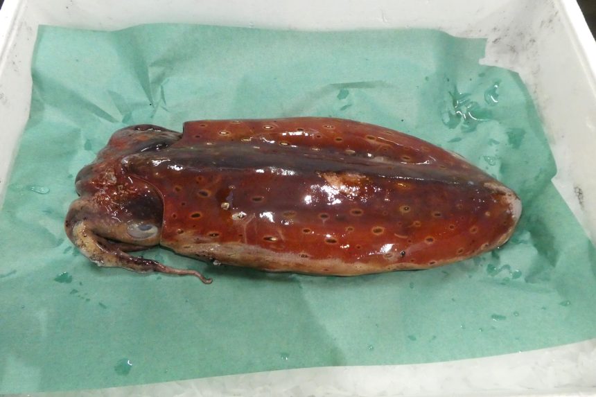 【オオスジハタ】成長にともない、色や模様が変わる魚がいます。写真は2枚とも同じ魚。オオスジハタの幼魚は黒色に縁どられた2本の白色縦帯がありますが、上の成魚(愛媛県産)では白色域は暗色に、黒色の縁取りは縦点列となります。これが下の老成魚(長崎県産、5.8kg)では、この点列は消失します。