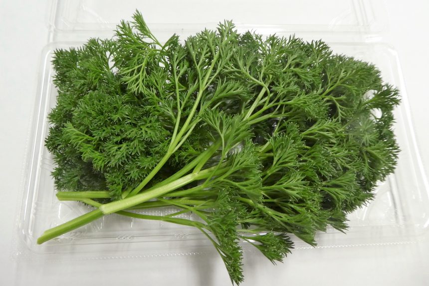 【パセリ】ディルにも似ていますが、写真は栃木県産の「羽葉パセリ」。市場で「エレガント、でもしっかりパセリ」と説明書きがありました。栄養価は高いのに添え物のイメージが強いですが、これは香りが高く、葉が繊細でフワッとし、オシャレな印象もあります。イメージを塗り替えられるでしょうか?