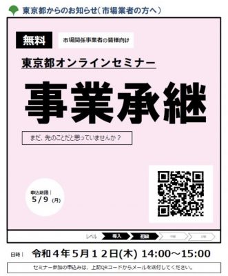 《当セミナーは終了しております》東京都中央卸売市場は5月12日、事業承継をテーマとした市場関係者向けオンラインセミナーを開催します。レベルは「導入」「初級」。「会社を後世に引き継いでいきたい」「会社の未来のために準備しておきたい」「事業承継の種類や手法が知りたい」といった皆様向けの内容となっています。受講料は無料。5月9日までに申し込みをお願いします。セミナーは12日14時から1時間程度。詳しくは東京都HPまで。