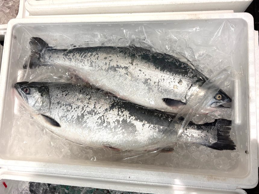 【マサバ】秋から冬にかけて旬を迎えるなか、ブランド魚として名高い「関さば」が入荷していました。「関あじ」とともに地域団体商標で、大分県漁協佐賀関(さがのせき)支店の出荷証明のタグが目印です。一本釣りで漁獲したマサバを活きたまま港へ持ち帰り、活締めして出荷したもの。刺身などで。