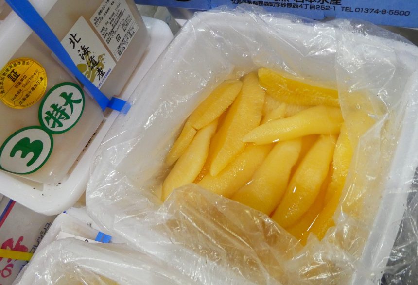 【ズワイガニ】兵庫県浜坂で、1杯1,000万円という過去最高値でスタートを切った今期の富山県以西のズワイガニ漁。本日豊洲にも、浜坂や香住(兵庫県)などからメスとともに入荷。オスは「松葉がに」「越前がに」、メスは「せこがに」「香箱がに」などとも呼ばれます。メスはオスの約半分の大きさ。