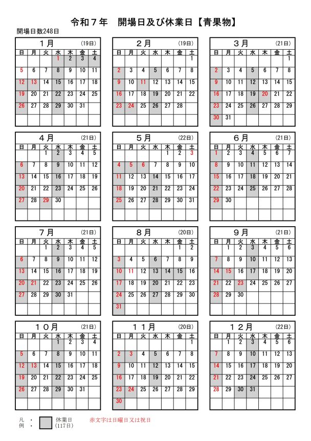 水産物部のみ開市(青果部は休市)となるのは、1月15日(水)、2月26日(水)、10月15日(水)、11月5日(水)、12月30日(火)の5日間。