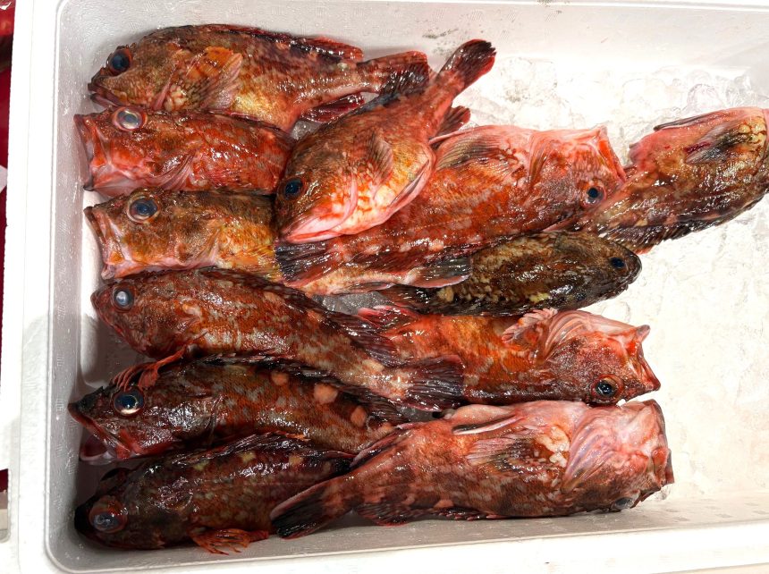 【クロハタ】昨年9月、入荷がとても珍しいと紹介したハタ科の魚(高知県宿毛産)。今回は沖縄県から入荷しました。体は黒く、腹側面、胸びれの後方に白色帯があるのが特徴です。口の内面は赤橙色。日本では三重県、和歌山県、高知県、琉球諸島など、南日本の太平洋沿岸のサンゴ礁の外縁部に生息。