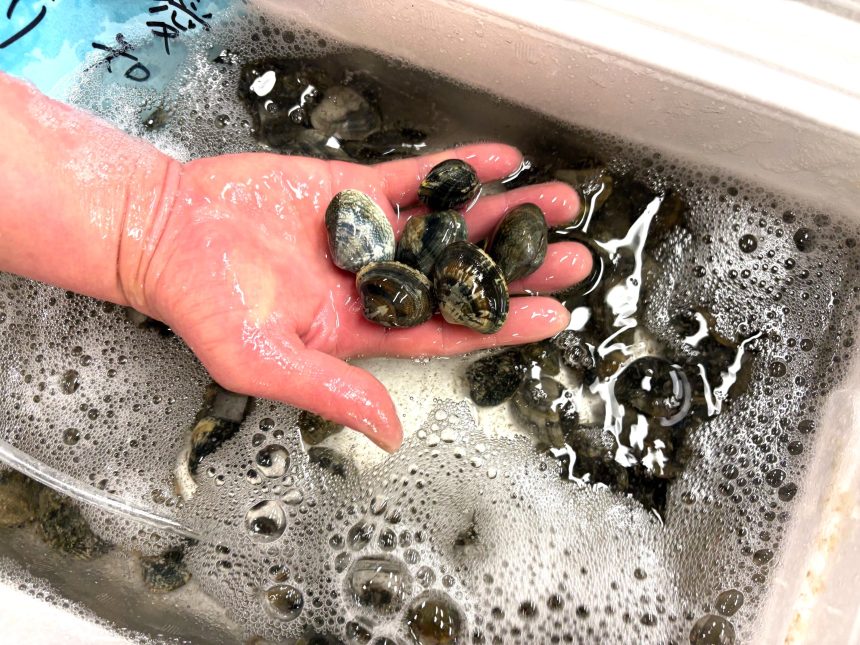 【ウチムラサキ】通称「大あさり」。仲卸では「ウチムラサキ(大あさり)」と表記。外側はウバガイ(ほっきがい)のようにも見えますし、アサリに似ていなくもありませんが、貝殻の内側全体は見事なほどの紫色です。潮間帯から水深20mの砂泥底に生息。写真は三重県産。焼いて食べるほか、酒蒸しなど。