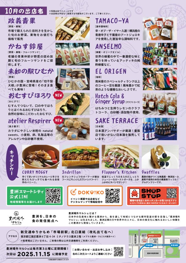 今月は18日土曜日の開催。豊洲市場からは新たに「豊洲市場商店会」が登場し、マグロや玉子焼き、練り物などが並びます。注目は東京で作られていて、商店会ブースでしか買えない「市場納豆」です。青果は「政義青果」が旬の野菜・果物を値打ち価格で販売。「かねす鈴屋」が野菜の詰め放題と旬のフルーツサンドを販売します。