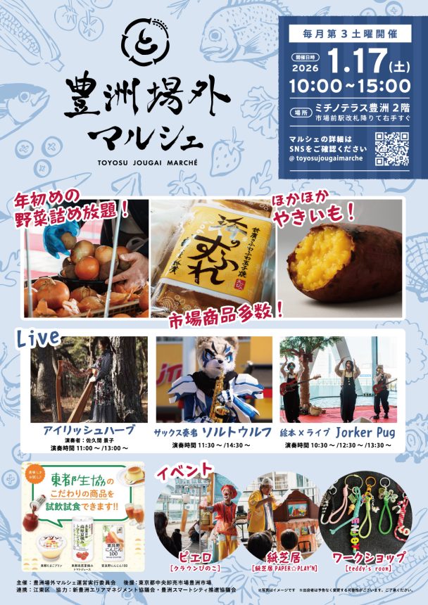 東京都中央卸売市場は、豊洲市場外の「豊洲千客万来」の食楽棟2階にあるPRコーナー「いちばの広場」などで、定期的にイベントを行っています。