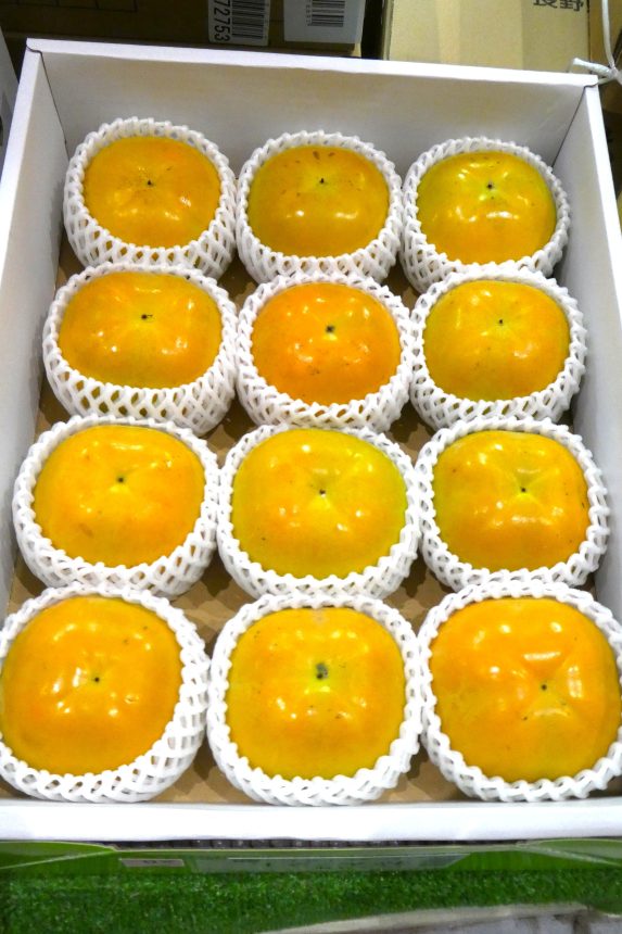 【カキ】カキには甘ガキと渋ガキがありますが、写真は完全甘ガキ品種の「太秋(たいしゅう)」。農研機構が「富有」に「IIiG-16」を交配して育成し、1995年に品種登録されました。果皮は鈍い橙色で、果実は320g程度と大きい。サクサクとした食感が特徴。果肉はやわらかく、ジューシーで、甘みが強い。愛媛県産。