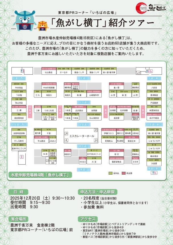 東京都中央卸売市場は、豊洲市場外の「豊洲千客万来」の食楽棟2階にあるPRコーナー「いちばの広場」などで、定期的にイベントを行っています。