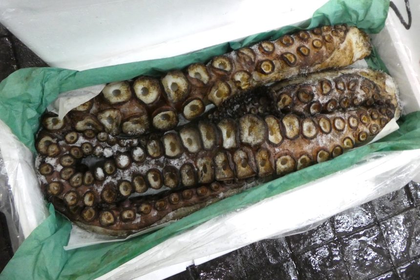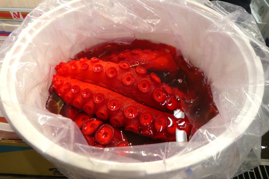 【たこ類】縁起が良いといわれるのは「多幸(たこ)」や赤い色、8本足が末広がりなどから。市場にはマダコ、ミズダコ、ヤナギダコなどが入荷します。その形態は様々で、活けや生のほか、ボイルや酢漬け、焼きなど。真っ赤に染まった「酢だこ」を食べる習慣があるのは関東から北の地域といわれます。