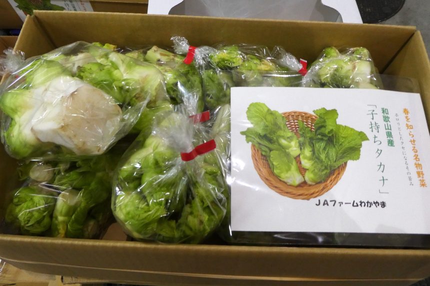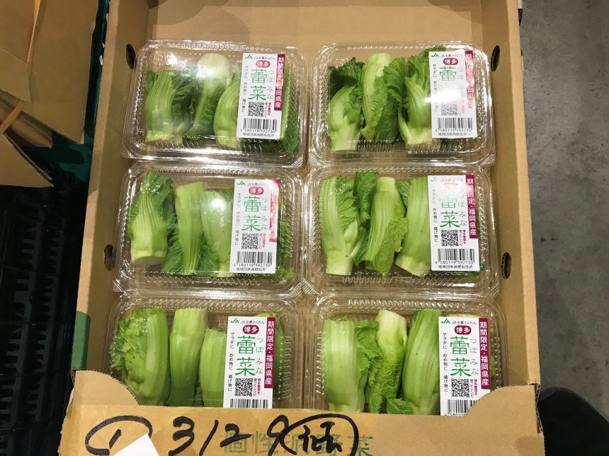 【ツボミナなど】春先に出回るアブラナ科の大型からし菜の一種。1株4~5kgにもなる大きな株のわき芽の部分。コリコリとした食感が特徴で、各産地から入荷しています。福岡県で品種改良された「博多蕾菜」をはじめ、高知県からは「四万十春蕾(はるつぼみ)」、和歌山県からは「子持ちタカナ」など。