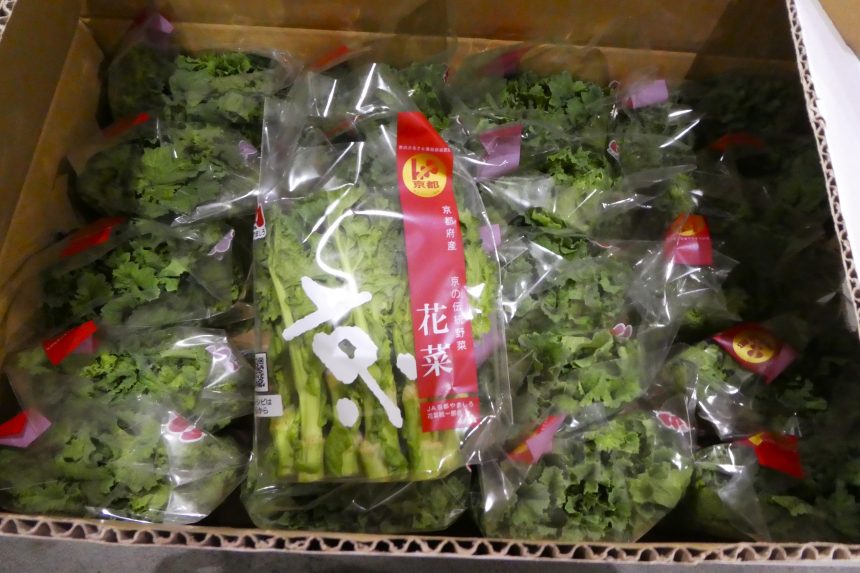 【花菜】「京のブランド産品」の1つ、「花菜(はなな)」。切り花用として栽培されていた、「伏見寒咲きなたね」の蕾(つぼみ)を食用にしたもの。ぎゅっと詰まった蕾には心地よい歯応えがあり、独特のほろ苦さもあります。からし和えやお浸し、漬け物や汁の実など。まさに春を運んでくるようです。