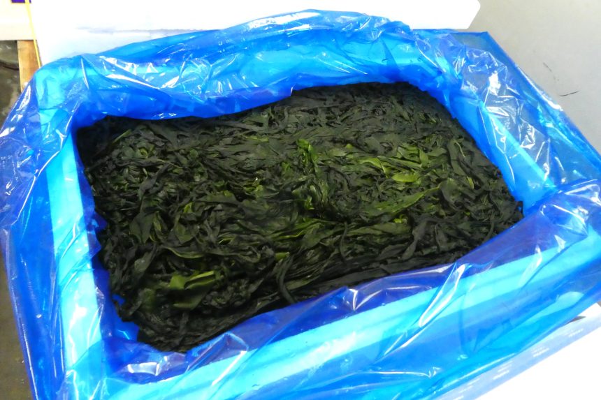 【ワカメ】冬から春にかけて多くの海藻類が入荷します。主力のワカメの生鮮品が味わえるのは今だけの期間限定。ワカメは褐藻なので、元は褐色ですが、熱湯にくぐらせると磯の香りが広がり、緑色へ。写真の生鮮品、ボイルともに宮城県産。生鮮のワカメは、神奈川県佐島や愛知県師崎などからも入荷中。