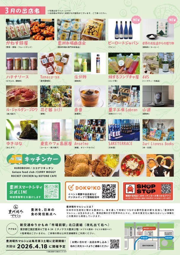 今月の開催は21日土曜日。生鮮品では、野菜の詰め放題やマグロのブツの販売など。出店は、野菜・果物・フルーツサンドの「かねす鈴屋」、豊洲市場の専門仲卸の商品が並ぶ「豊洲市場商店会」をはじめ、ワイン、日本酒、ピクルス、コーヒー、焼き菓子、激辛調味料など。キッチンカーも登場します。