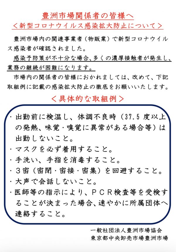 市場NEWS 2020.8.19 【重要】市場関係者の新型コロナ感染者の発生について 東京都は19日、豊洲市場関係者1人が新型コロナウイルスに感染したと発表しました。保健所等の指導のもと、濃厚接触者の確認、当該箇所の消毒を終えております。なお、19日は休市です。 当該感染者は市場内事業者従業 […]